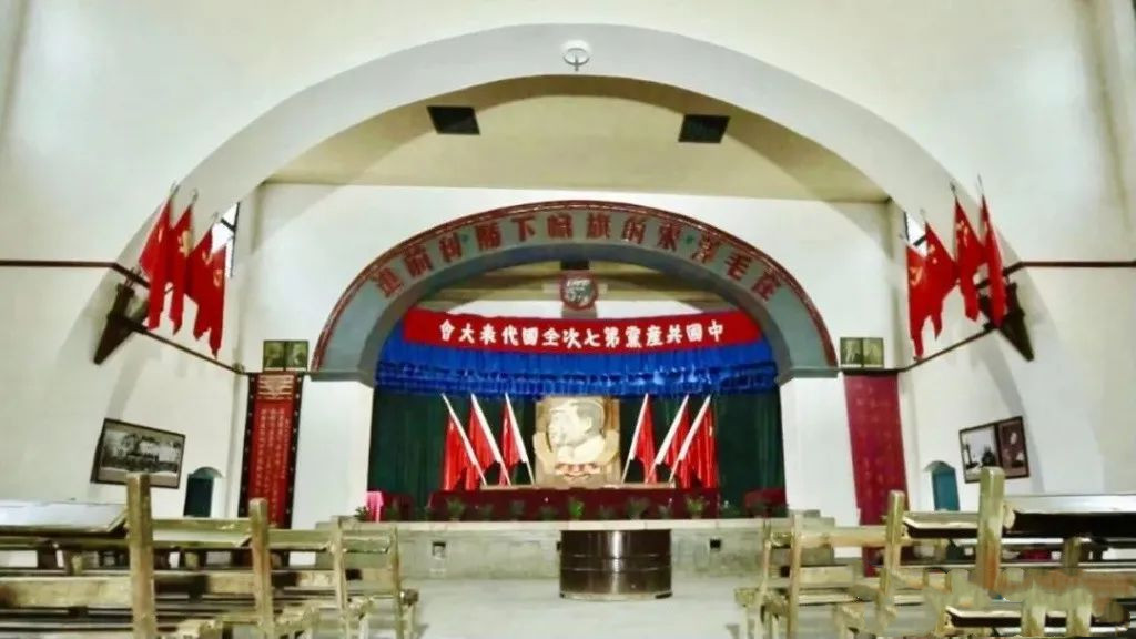 中央大礼堂,建于1942年,礼堂为砖石结构,室内屋顶为大跨度穹窿式,礼堂长35米,宽30米,高11米,可容千人。1945年4月至6月,党的七大在此召开。