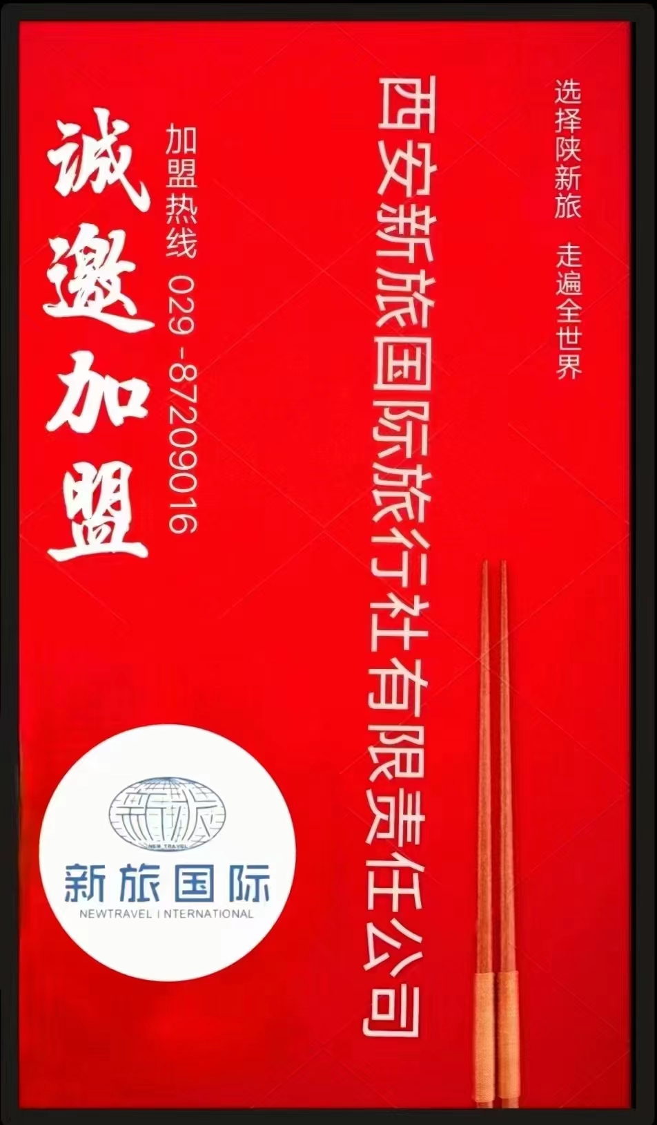 因企业规模扩大、市场发展需求,现面向全国诚邀分支机构加盟!诚邀分公司加盟、营业网点加盟、同业批发专线部门加盟、户外游项目加盟、自驾游俱乐部加盟、网络中心加盟、票务中心加盟。每县限门市和分公司各一家,欢迎来电029-8720 0345;029-8720 0337;029-8720 9016;029-8720 9549垂询!
