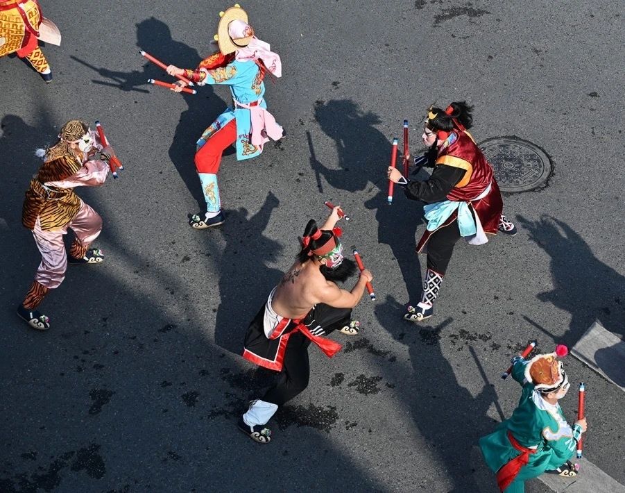 当急促的锣鼓声响起,一群“梁山好汉”闪亮登场,他们挥动英歌槌,快速翻转叩击,步伐铿锵有力,呐喊声响彻四方,所到之处一片欢腾。