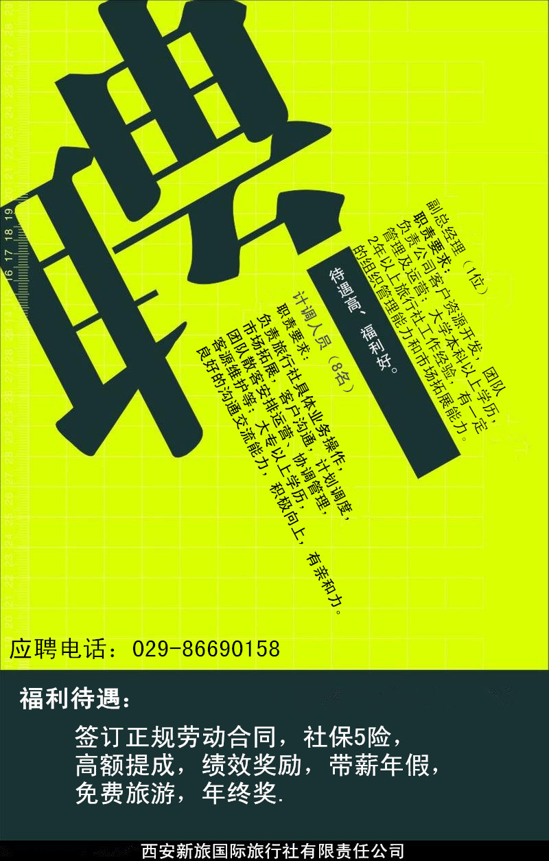 福利待遇:签订正规劳动合同、社保五险、高额提成、绩效奖励、带薪年假、免费旅游、年终奖。