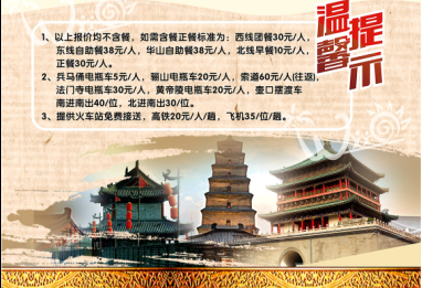 备注:陕西景区多为国家 5A 级无烟无噪音景区,为了更加深入的了解秦唐文化,建议自费租用无线蓝牙耳机,既尊重景区规定做文明旅游人,又紧跟导游步伐聆听历史的变革,不虚此行。