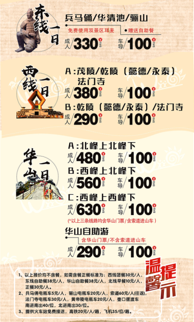 ★ 二环内免费接送,出行当天凭姓名、联系方式乘坐旅游车,二环外可在小寨体育场、南门、钟楼、玉祥门、北门、东门等地集合,详情咨询旅行社;